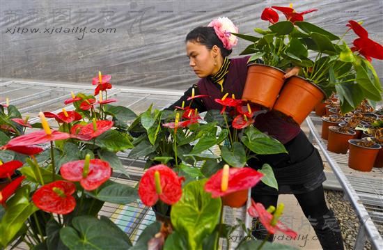 2013年12月19日,员工阿依先木古丽在整理花卉。疏勒县香妃湖花卉庄园是山东省重点农业援疆项目,目前已建成85个花卉温室,为当地农民家门口就业增收发挥了积极作用。