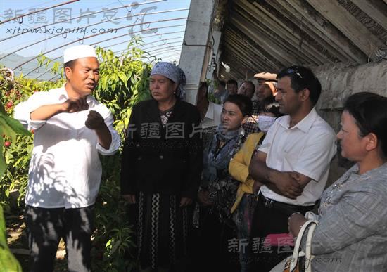 2014年6月12日,兵团第五师86团设施农业产业协会会长、团艾家果蔬公司职工马云(左一)在向该团少数民族职工介绍创业经验。