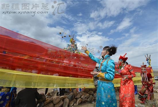 当日,巴里坤哈萨克自治县的蒙古族群众迎来一年一度的敖包节,身着节日盛装的蒙古族群众按照传统的方式祭祀敖包,观看表演文艺节目。