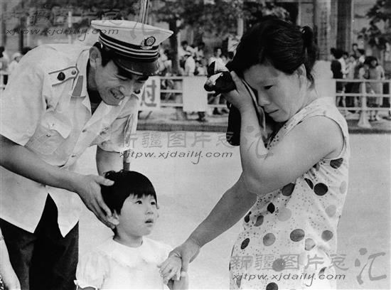 1987年6月11日,乌鲁木齐市,一位家长在带着孩子外出时不慎与孩子走失。后在执勤警察的帮助下得以寻找到丢失的孩子。