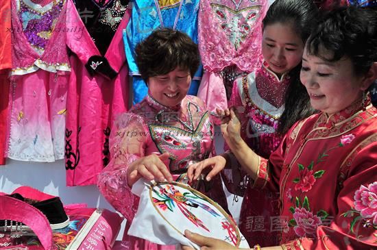 2014年6月14日,锡伯族“绣娘”在交流传统刺绣技艺。