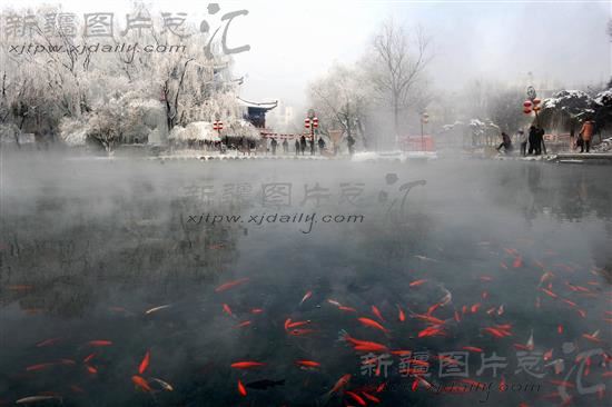 2012年1月29日,游客在水磨沟公园赏鱼观景。春节期间,乌鲁木齐气温持续走低,水磨沟公园温泉弥漫的雾气使岸边树木挂满了雾凇,雪白的雾凇与河中青翠水草间漫游的观赏鱼相映成趣宛如仙境,吸引了不少游客前来观赏。