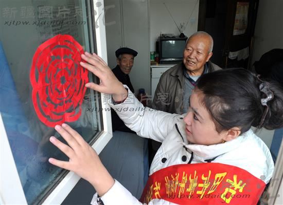 2012年1月16日,志愿者在为和田市中心敬老院的老人张贴窗花。当日,和田市开展以丰富群众节日文化生活、关爱困难群众为主的志愿者服务活动,为新春佳节的到来营造温馨和谐的氛围。