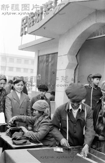 1986年,喀什民族服装厂,该厂团员青年在义务为群众裁衣锁边。