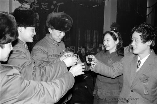 1986年2月2日,市妇联、团委等八个单位共同举办集体婚礼,这是新人在向老战友敬酒。