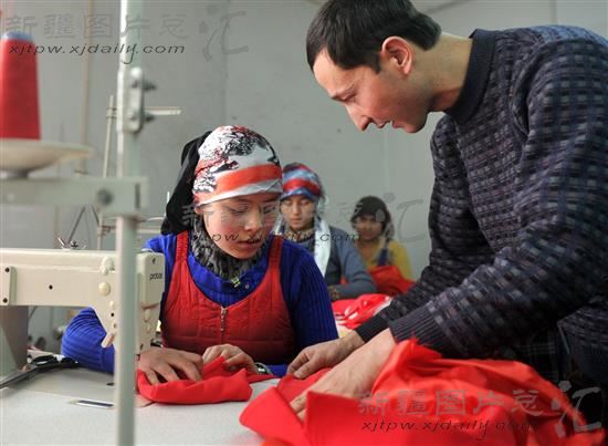 2012年1月19日,缝纫技校教师玉素甫江·阿不都拉(右)在指导学员进行缝纫实机操作。近年来,新疆和田地区墨玉县结合本县富余劳动力多、技术工人少的实际,采用多种形式,开展了以法律知识、汉语常识、寻找就业岗位、市场就业等方面的培训课程。2011年,全县共开展农业富余劳动力转移就业技能培训班230期,培训农业富余劳动力12753人,形成了以培训带动就业的新格局。