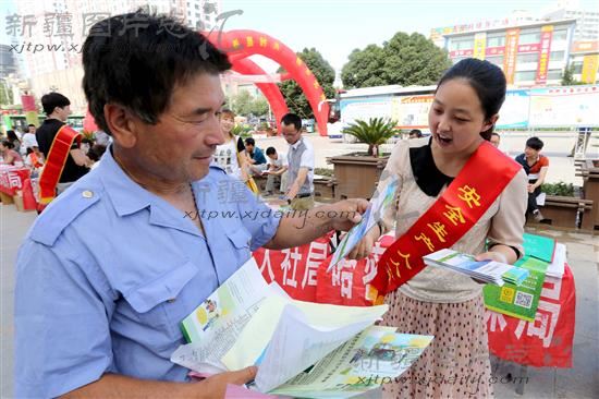 2014年6月16日,志愿者在哈密市街头为市民发放安全知识宣传资料。