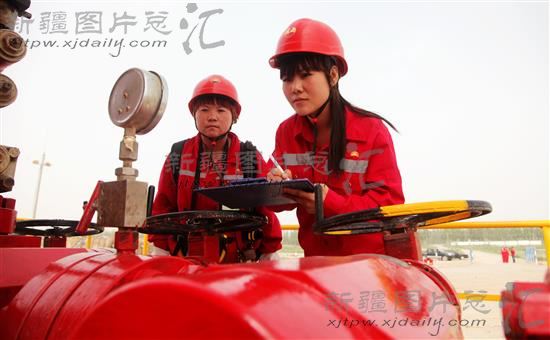 2014年6月17日,库车县塔里木石油运输公司新招录的当地青年在检查采油设备。