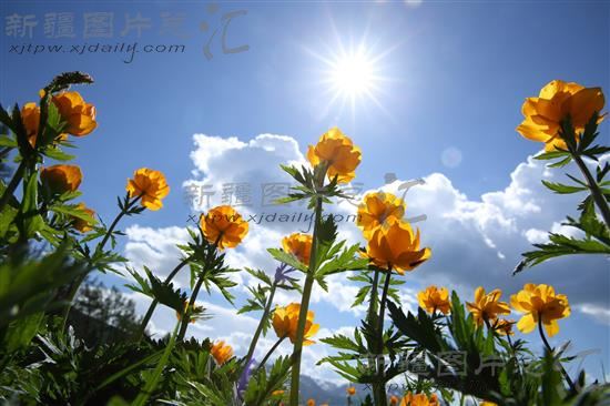 关键字:哈巴河县 草原 花卉 金莲花 风景 风光 蓝天 白云 野生植物
