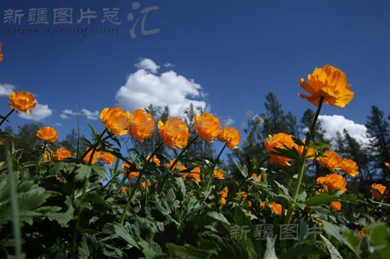 关键字:哈巴河县 草原 花卉 金莲花 风景 风光 蓝天 白云 野生植物