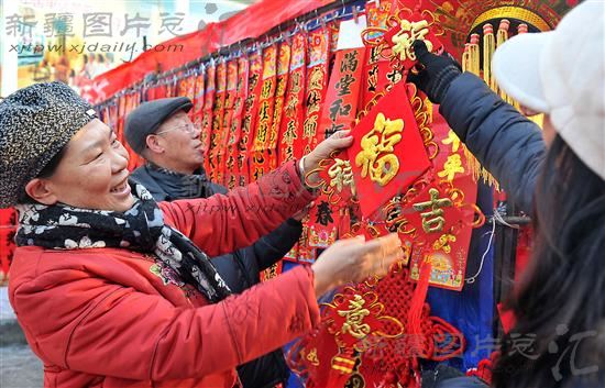 2012年1月16日,市民在选购节日饰品。随着农历龙年的临近,阿勒泰市大街小巷张灯结彩,各种喜庆用品琳琅满目,大红灯笼、红色的“福”字挂件成为市民喜爱的过年饰品。