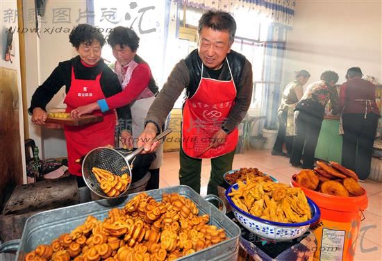 2012年1月14日,巴里坤哈萨克自治县大河镇旧户西村农民赵建国与帮忙的邻居在制作油炸食品。近日,巴里坤哈萨克自治县住进“安居富民”新房的农民,为庆祝在新居里度过的第一个春节,家家户户扮新房、备年货、蒸年馍。