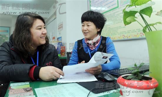 2012年2月8日,新疆教育学院毕业生阿米热(左)在乌鲁木齐市天山区黑甲山片区富康街社区与工作人员一起交流入户采集居民信息的有关问题。据了解,该社区设立了计划生育服务站、民政服务站、劳动保障服务站、党建服务站、医疗卫生服务站等公益性岗位,为大学毕业生以及下岗人员创造了平台。目前该社区已有35人在公益性岗位工作。