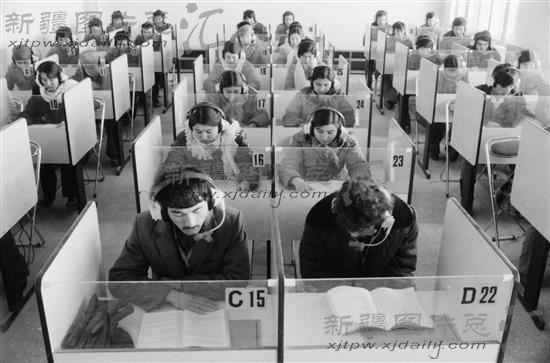 学生在塔里木农垦大学现代化的语音室里学习(摄于1988年)。