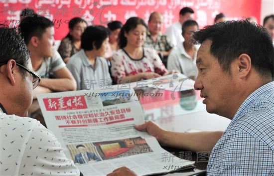 6月20日,乌苏市虹桥街道解放路社区工作人员及辖区居民一起学习自治区党委八届七次全委(扩大)会议精神。