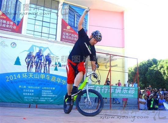 2014年6月21日,一名参赛者表演车技。当日,第二届“裕民山花杯”环阿克乔克草原山地自行车赛在裕民县开赛,来自乌鲁木齐、克拉玛依、塔城的140余名参赛选手及业余自行车爱好者参加了此次活动。