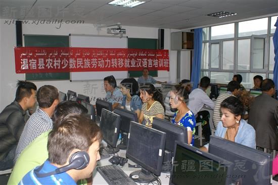 2014年6月19日,新疆阿克苏地区温宿县青年进行汉语基本知识考试。为鼓励农村有志青年走出家门挣钱,5月5日-6月19日,温宿县人社局、团县委联合举办为期45天的农村青年国语培训班,来自全县各乡(镇)、场30周岁以下初高中毕业的返乡青年100人参加了培训。这为学员们自主创业,外出务工创造了良好的条件。据悉,今年该县计划培训农村富余劳动力400人,现已完成培训200人。