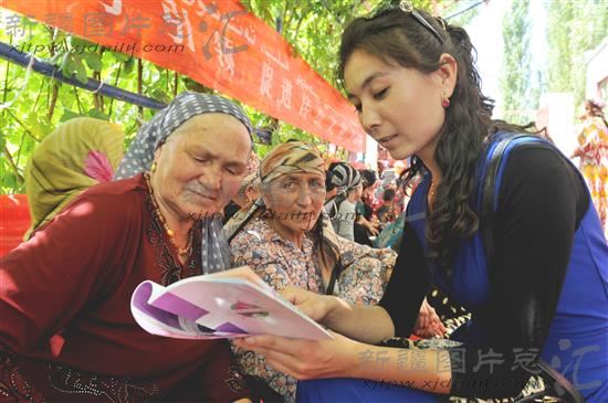 2014年6月24日,伊宁县莫洛托乎提于孜乡莫洛托乎提于孜村的大学生“村官”玛依热木·努力买买提,在给村民宣传党的民族宗教政策。