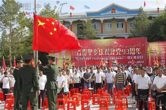 2014年6月25日,党员集会日上的升旗仪式。当天,博乐市青得里乡举办了建党93周年党员集会日活动,全乡500多名党员到场参与。活动中,党员们重温了入党誓词,表彰了优秀党员和优秀党务工作者,还进行了“爱我家园”集体宣誓、百人签名等多种活动。