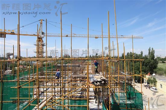 2014年6月10日,工人在精河县茫丁乡东庄村安居富民工程工地上施工。