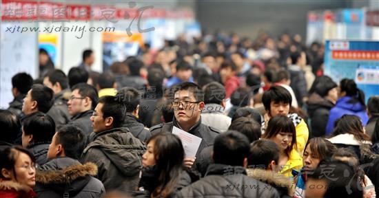 2012年2月11日,应聘者穿梭在人头攒动的招聘会现场。当日,为期两天的“共青团 助就业”2012年大型春季人才招聘会在新疆国际博览中心举办。来自疆内外近600家用工单位提供了2万余个以化工、能源、电力等技术类为主的工作岗位。万余名大中专毕业生、下岗职工和待业人员参加了招聘会。