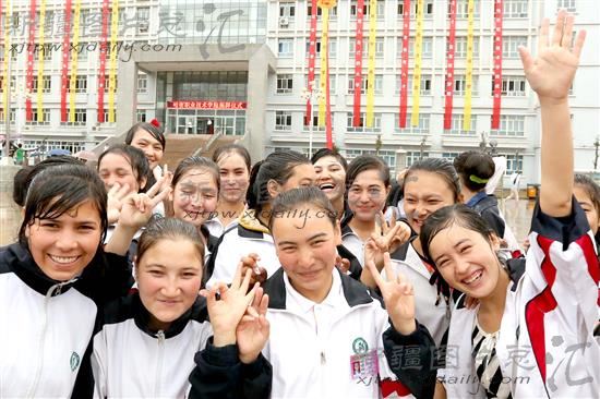 2014年6月26日,学生在雨中欢庆新疆哈密职业技术学院成立。
