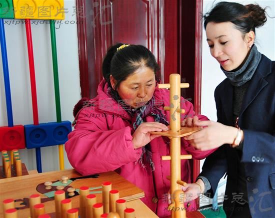 2012年2月22日,社区工作人员祖丽菲亚帮助居民做康复训练。2009年,和布克赛尔蒙古自治县和布克赛尔镇巴格茨社区建起了残疾人康复服务站,并配备了康复辅导员,几年来,一直免费为辖区及附近社区的残疾人提供康复训练。