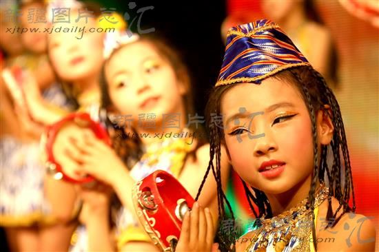 2014年6月26日,新疆哈密南粤文化中心几名小朋友在表演民族舞蹈。