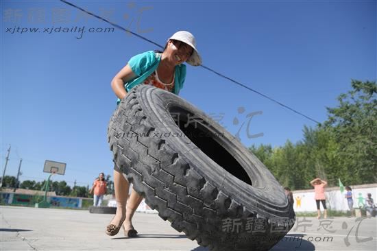 2014年6月27日,温泉县哈日布呼镇查干阿热勒村村民在参加翻轮胎比赛。