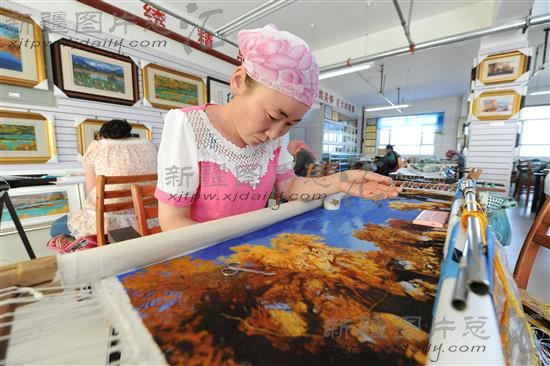 2014年6月30日,位于木垒哈萨克自治县民族刺绣产业园的佳艺劳民族刺绣有限公司里,哈萨克族绣娘帕依古丽在绣制作品《秋之丽》。