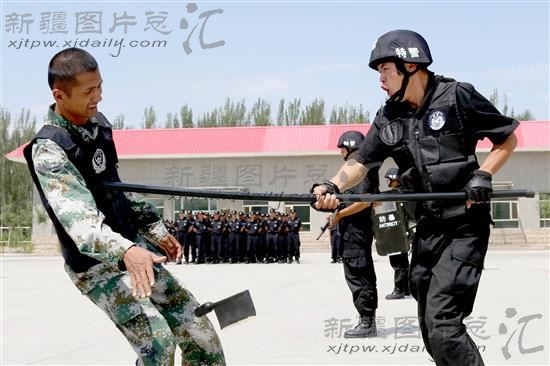 2014年6月29日,新疆哈密反恐维稳巡逻队员在进行搏击格斗实战训练。