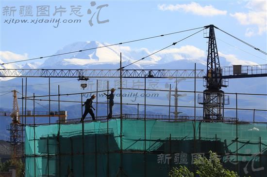 2014年7月2日,工人在新疆伊吾县城西区泰和花园保障性住房建设工地施工。