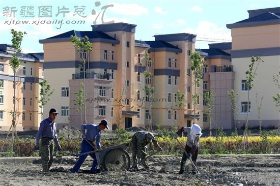 2014年7月2日,工人在新疆伊吾县城西区泰和花园保障性住房建设工地开展绿化美化工作。