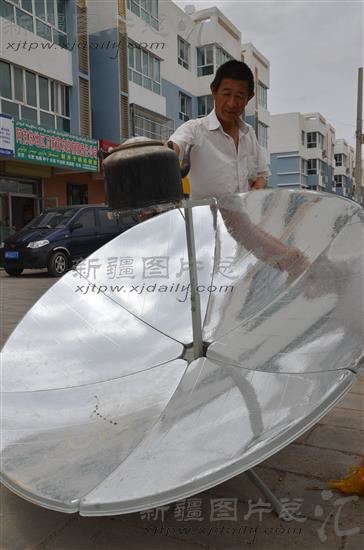2014年7月3日,新疆生产建设兵团第一师二团职工在用太阳能灶烧水。