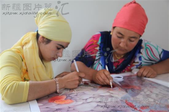 2014年7月2日,岳普湖县青年农民在“丝路沿柳”公司制作钻石绣产品。