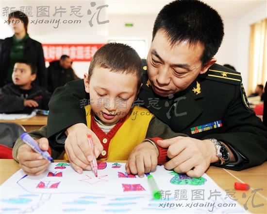 2012年2月26日,在乌鲁木齐市西山街道环卫路社区,沙依巴克区武装部干部正在和参加比赛的小朋友一起画画。当日,“我心中美丽的家园”儿童绘画比赛及资助活动在该社区举行。据了解,此次活动由沙区武装部、沙区妇联、新疆煤田地质局、西山街道办环卫路社区共同举办,环卫路社区工作人员组织辖区内近50名孩子参加了此次比赛。活动中,新疆煤田地质局156队为10名家庭贫困的孩子捐赠了学习用具。