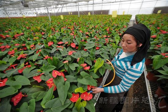 2012年2月13日,艾孜提古丽在新疆喀什地区疏勒县香妃湖花卉庄园智能温室里照看红掌花卉。据了解,疏勒县确定了产业带动区域经济发展的总体思路后,通过引进大企业大集团,引导农民就地转换成为产业工人.2011年该县农民人均纯收入达5426元,较上年增长480元。