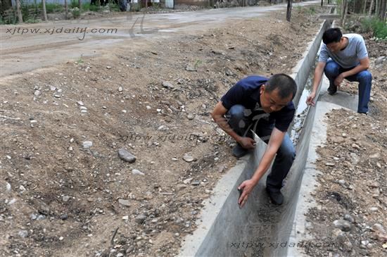 2014年7月2日,伊宁县扶贫办干部在该县墩麻扎镇托海村检查庭院供水防渗渠工程质量。6月初,伊宁县扶贫办投入90万元扶贫项目资金,在该县墩麻扎镇托海村、麻扎乡沃尔塔买里村、阿乌利亚乡阿乌利亚村等三个扶贫重点村修建总长9公里的庭院供水防渗渠,从根本上解决了贫困农牧民发展庭院经济中遇到的“浇水难”的问题。