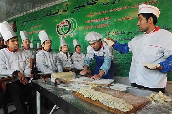 2012年1月21日,学员在新疆阿克苏地区库车县达维兰职业培训学校学习烹饪技术。从2009年至2011年,阿克苏地区已完成各类培训31.2万人,就业再就业培训5.1万人、农村富余劳动力转移就业培训9.6万人、劳动预备制培训3.5万人、创业培训2961人。“造血式”助学扶贫教育培训2782人,产业工人培训3386人,加快了实现人口大区向人力资源强区的历史性转变步伐。