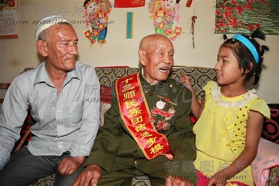 2014年7月3日,哈密市五堡镇五大队农民艾合买提·玉素甫(左)和家人看望兵团第十三师红星二场离休干部李宝山(中)。