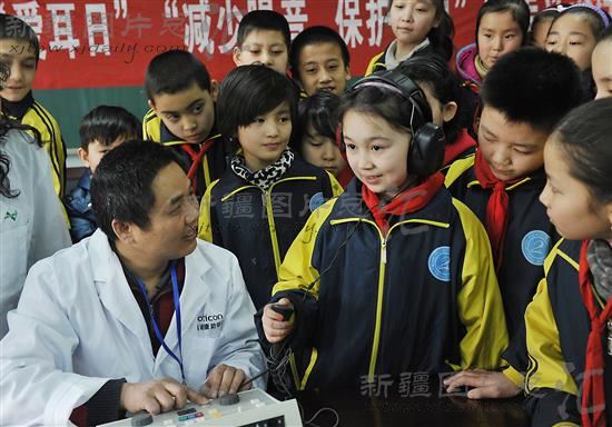 2012年2月24日,小学生在医生指导下体验听力检测。当日,乌鲁木齐市沙依巴克区长江街道办事处在乌鲁木齐市第24小学开展第十三次“全国爱耳日”宣传、义诊活动。
