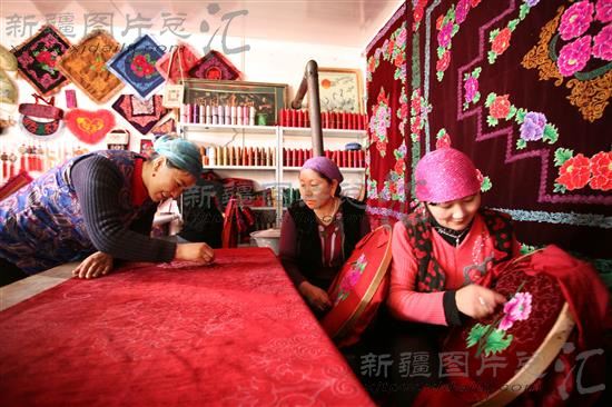 2012年2月1日,新疆伊犁哈萨克自治州尼勒克县喀拉苏乡柯赛绣厂的姐妹们用新学到的苏绣技法绣制作品。据了解,该厂自1997年开办以来,派出多批技术人员赴内地学习,不断创新哈萨克族传统刺绣技艺,现已开发设计出150种织绣产品,远销内地及哈萨克斯坦等国。带动当地200余名哈萨克妇女实现就业。
