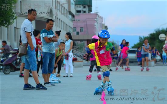 2014年7月3日傍晚,在博乐市金水桥附近的广场上市民们在散步、游玩 、拍照。