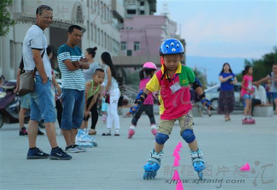 2014年7月3日傍晚,在博乐市金水桥附近的广场上市民们在散步、游玩 、拍照。