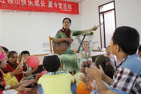 2014年7月14日,博乐市西郊社区文化能人在为孩子们表演都塔尔弹唱。
