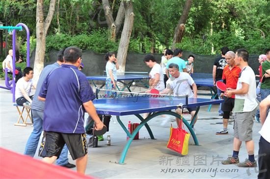 2014年7月4日,市民在乌鲁木齐市人民公园打乒乓球。