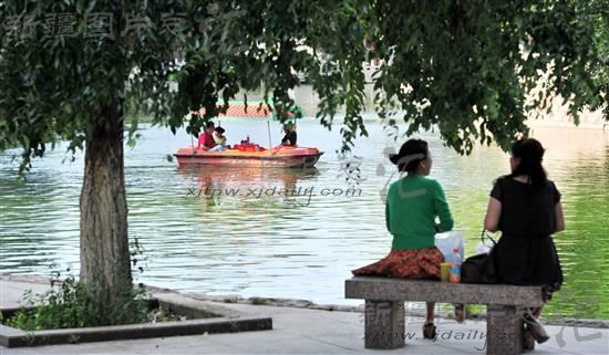 2014年7月4日,市民在乌鲁木齐市人民公园休闲纳凉,感受惬意生活。