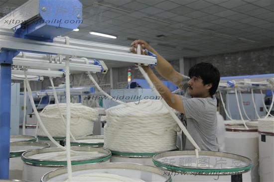 2014年7月2日,工人在岳普湖县正阳纺织有限公司车间操作。