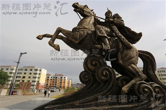 2014年7月4日,矗立在新疆巴里坤哈萨克自治县宁远路上的宁远大将军岳钟琪雕塑。