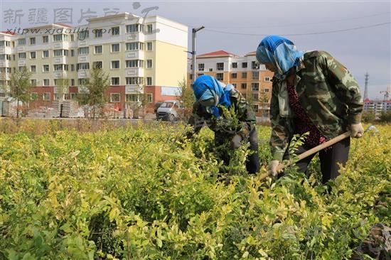 2014年7月4日,新疆巴里坤哈萨克自治县城街头,园林工人在开展绿化工作。